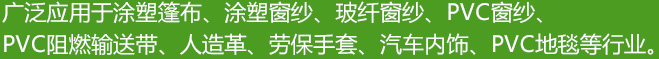 廣泛應用于涂塑篷布、涂塑窗紗、玻纖窗紗、PVC窗紗、PVC阻燃輸送帶、人造革、勞保手套、汽車內飾、pvc地毯等行業。
